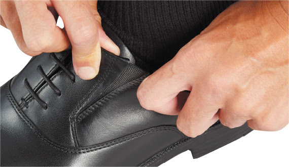 着脱をラクにするため履き口のサイドにゴムを配置。紐を解かずに脱ぎ履きが可能です。